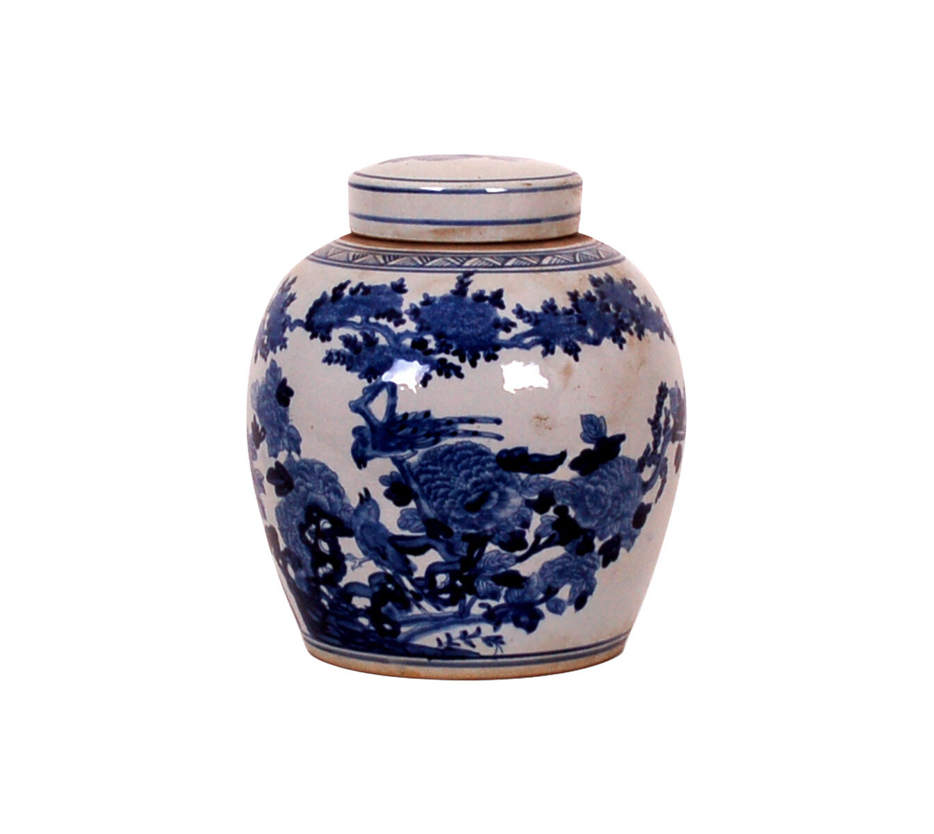 Reproduction porcelain jar featuring hand painted blue and white bird and flower design. Due to hand craftsmanship and hand painted design, final product may differ from what is shown in the photo.
