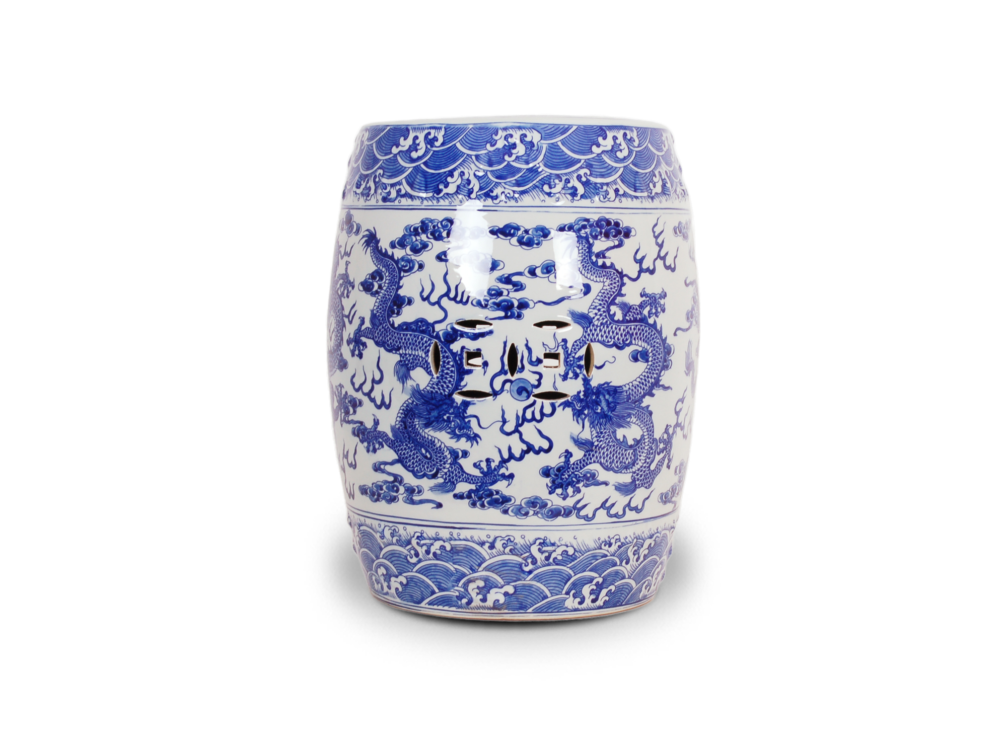 Reproduction porcelain garden seat featuring hand painted blue and white dragon design.