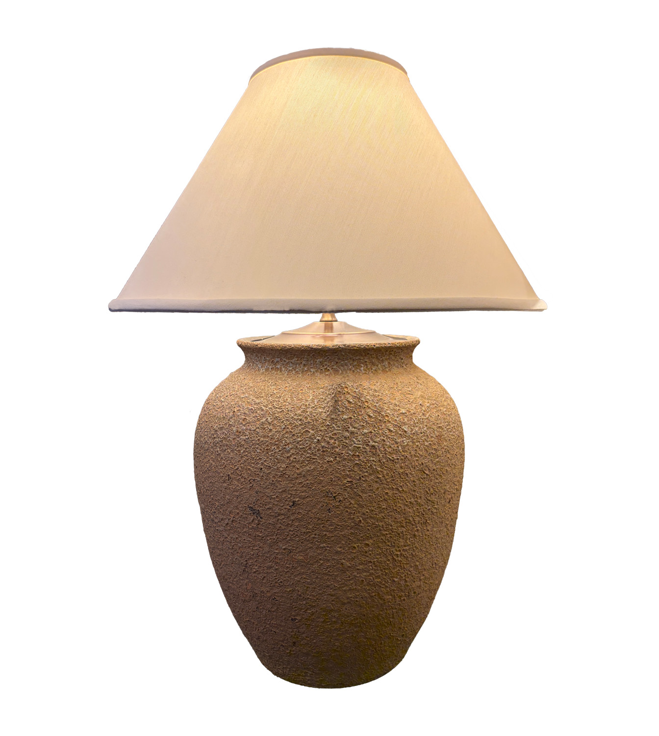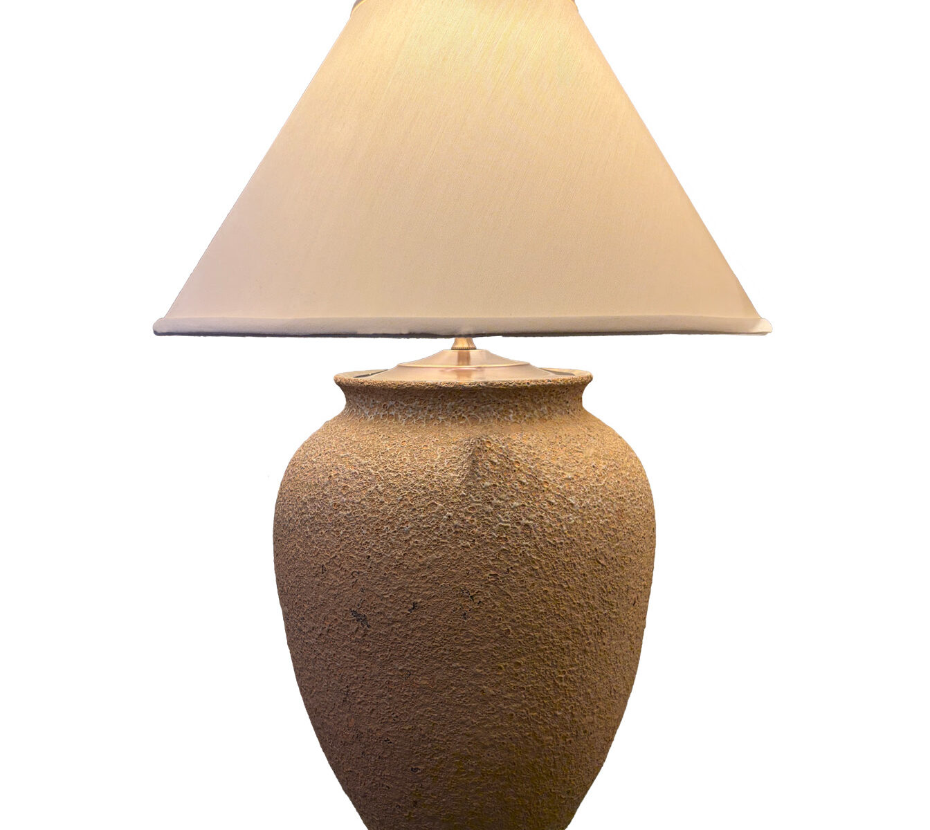 Vintage natural textured ball vase with flare shade. Wabi-sabi style lamp is assembled without base and includes flare hardback shade in off white. Features real brass hardware with hand-rubbed antique finish. All lamps are made to order and final sale.