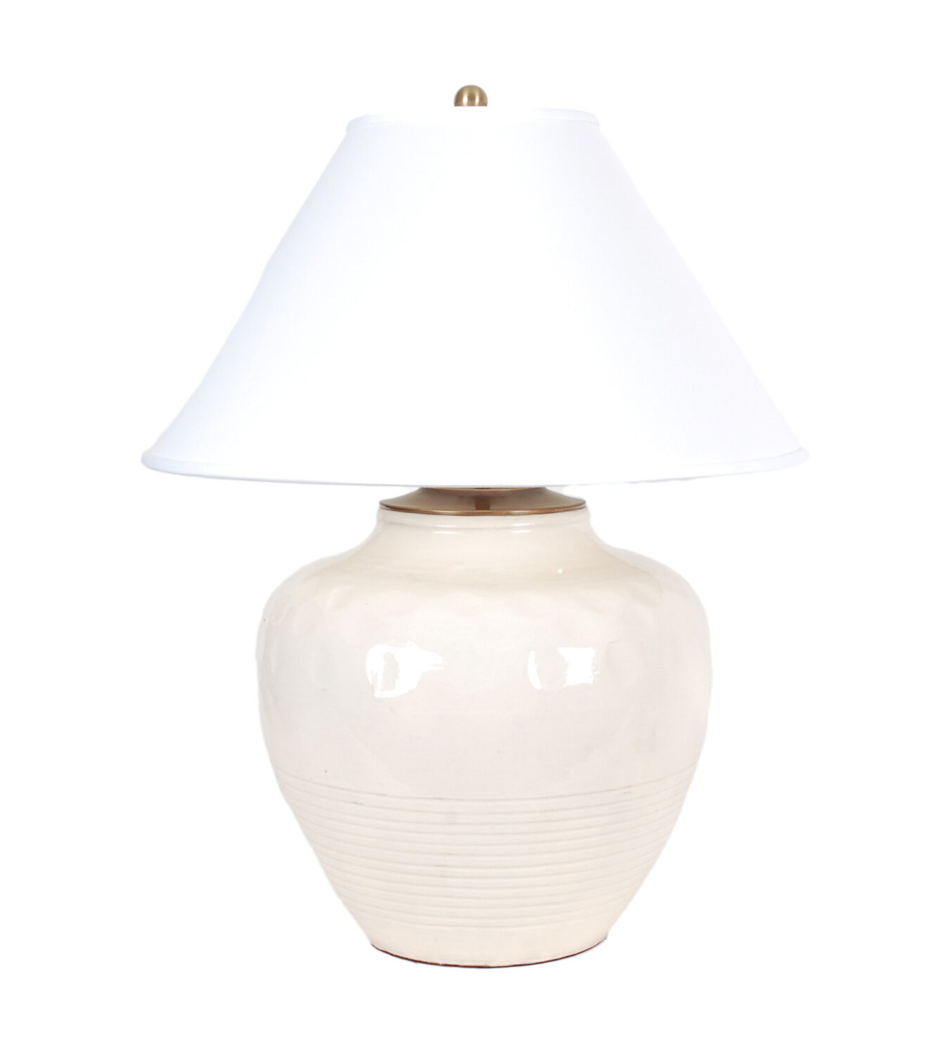 Vintage handmade cream vase lamp with dimpled pattern. Comes with a hardback flare shade and features hand-rubbed, antique brass hardware.