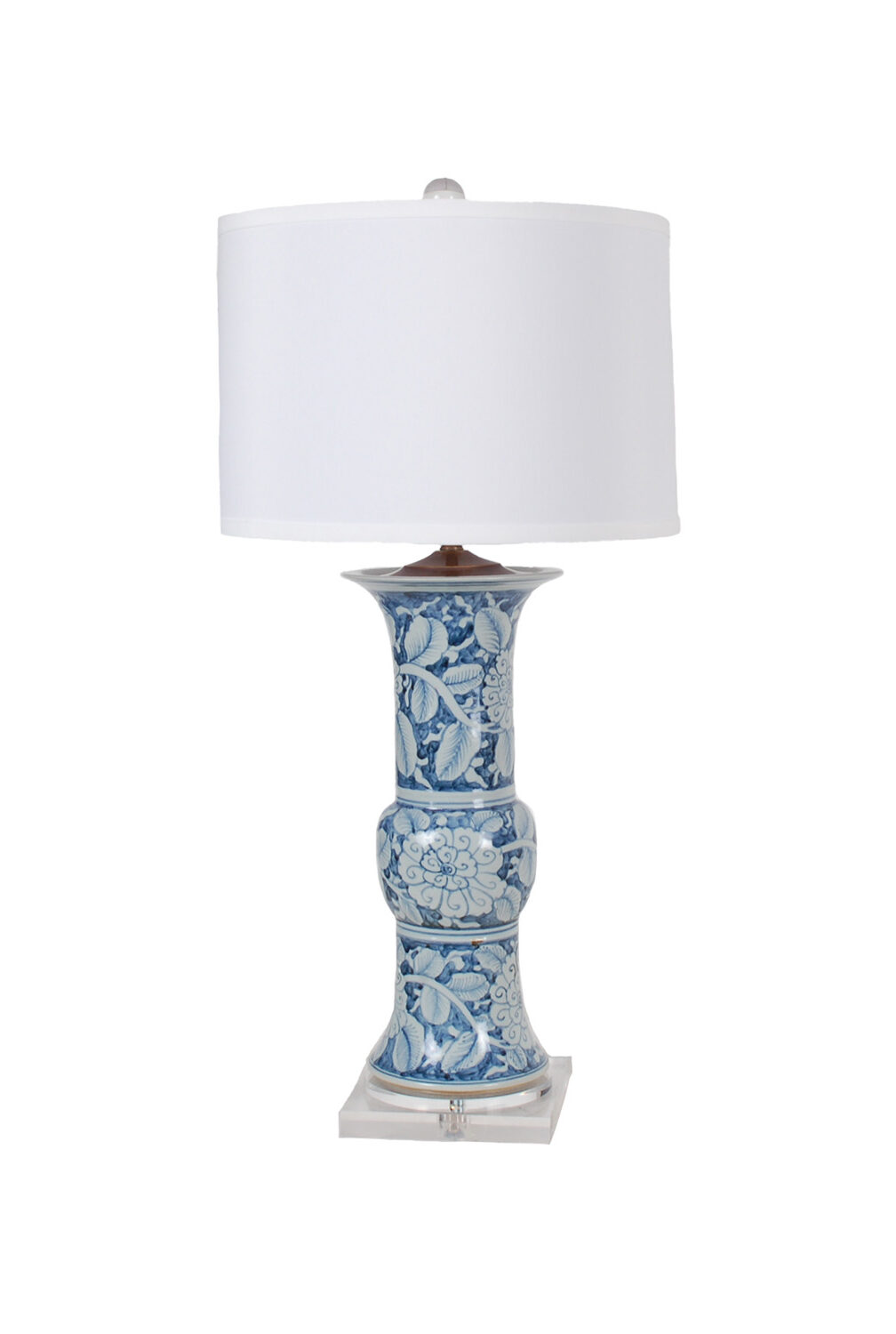 Reproduction porcelain beaker-shaped vase lamp with hand-painted blue and white floral design. Assembled on an acrylic base with a drum shade in white. Features real brass hardware with hand-rubbed antique finish, 3-way turn knob switch, and compatible with 150 watt bulb max. All lamps are made to order and final sale.