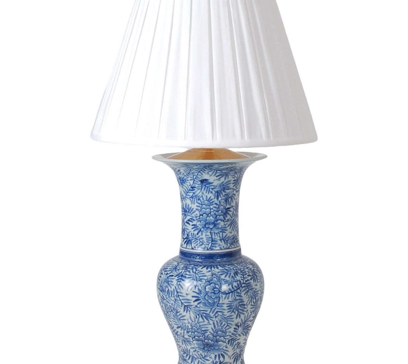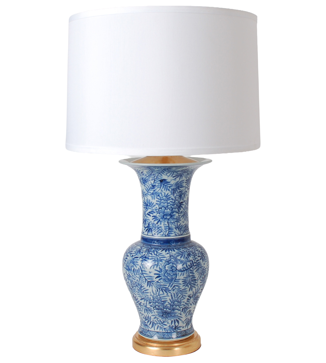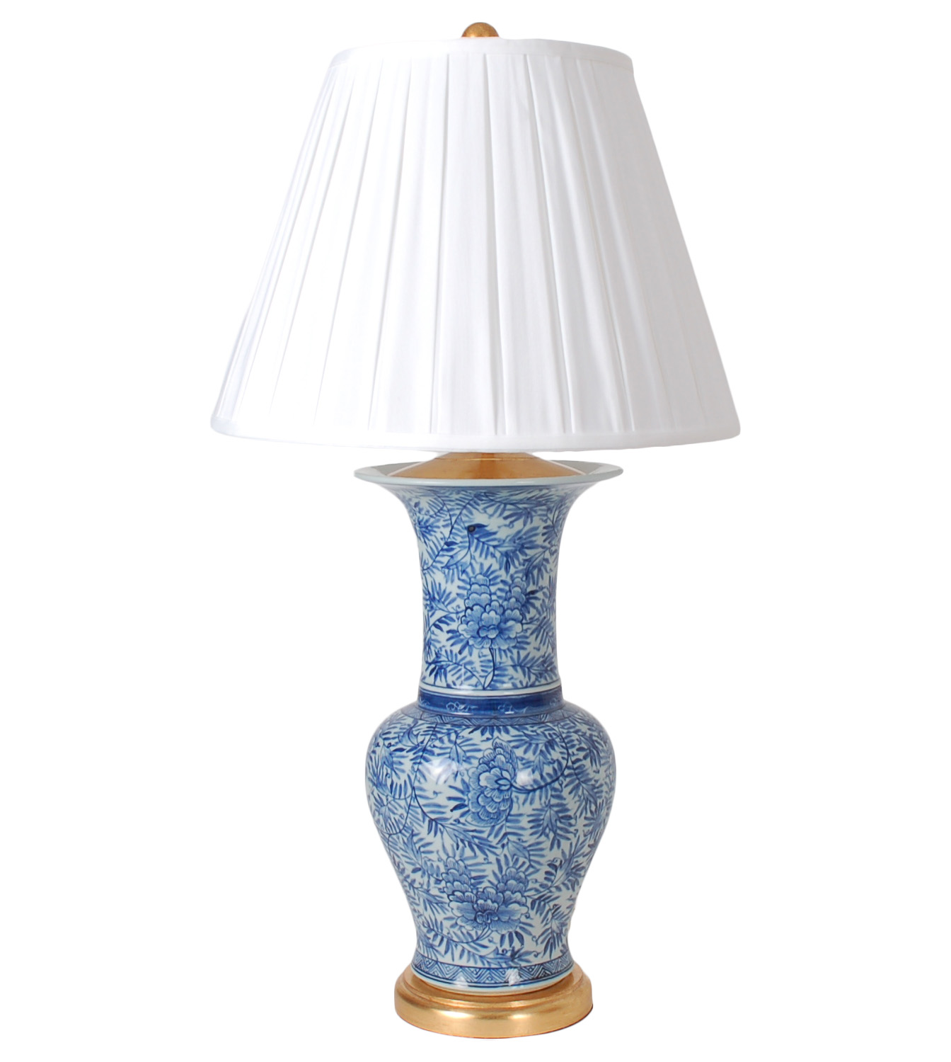 Reproduction porcelain vase lamp with hand-painted blue and white floral design. Assembled on a hand-gilded gold leaf base with English box pleated shade. Hardback drum shade is also available. Features hand-gilded gold leaf hardware and 3-way turn knob switch. Maximum bulb wattage is 150 watts. All lamps are made to order and final sale.