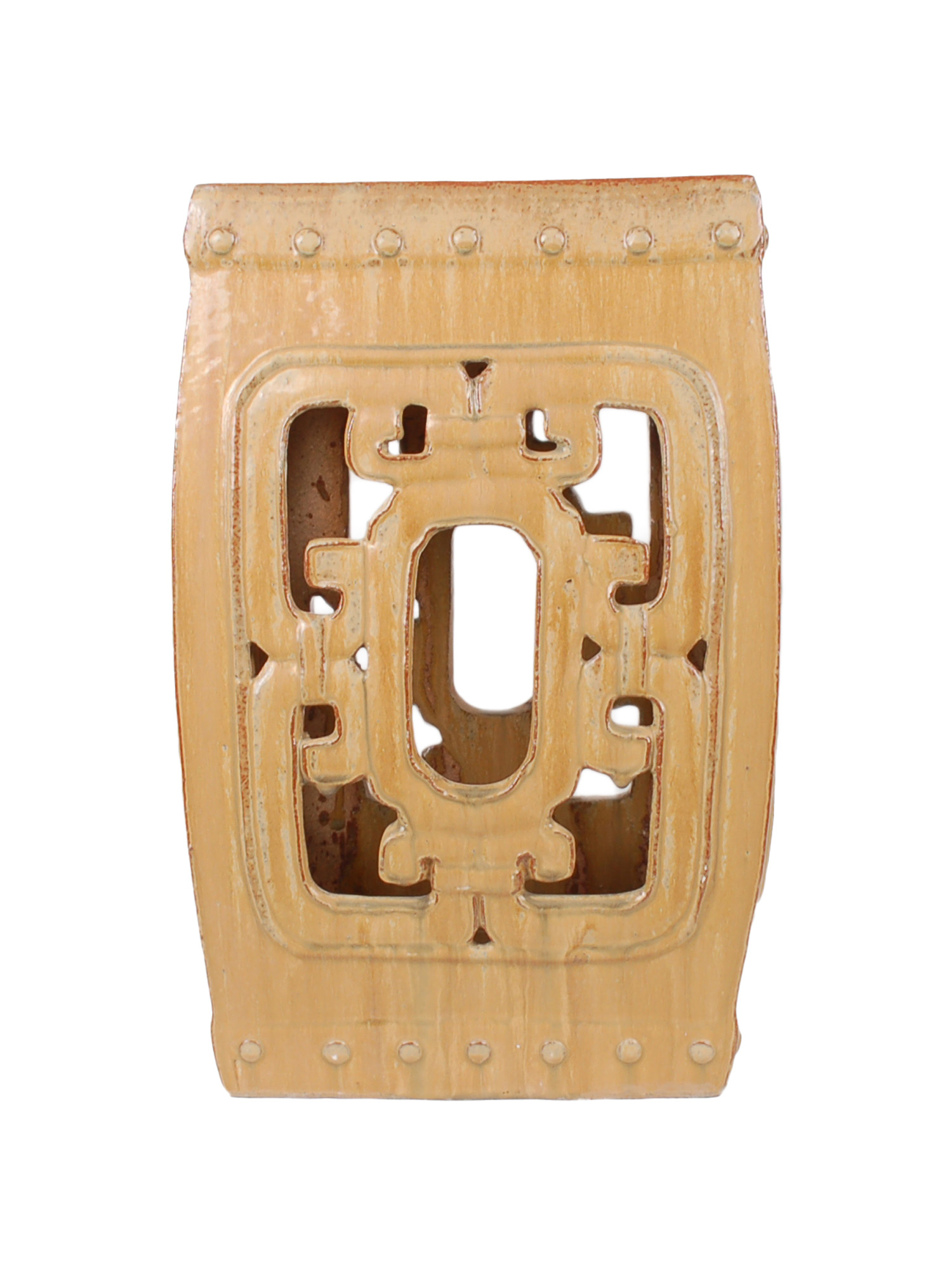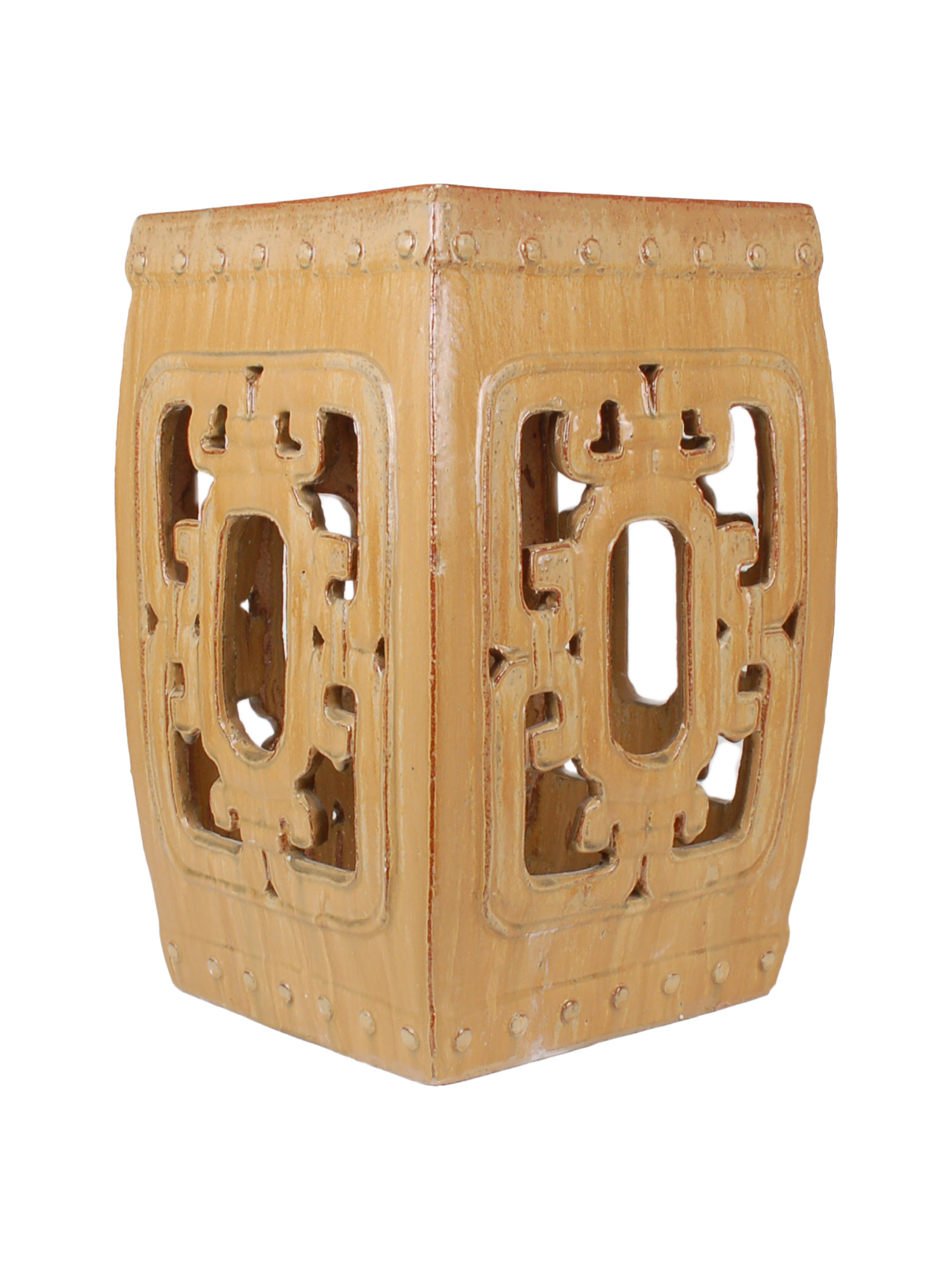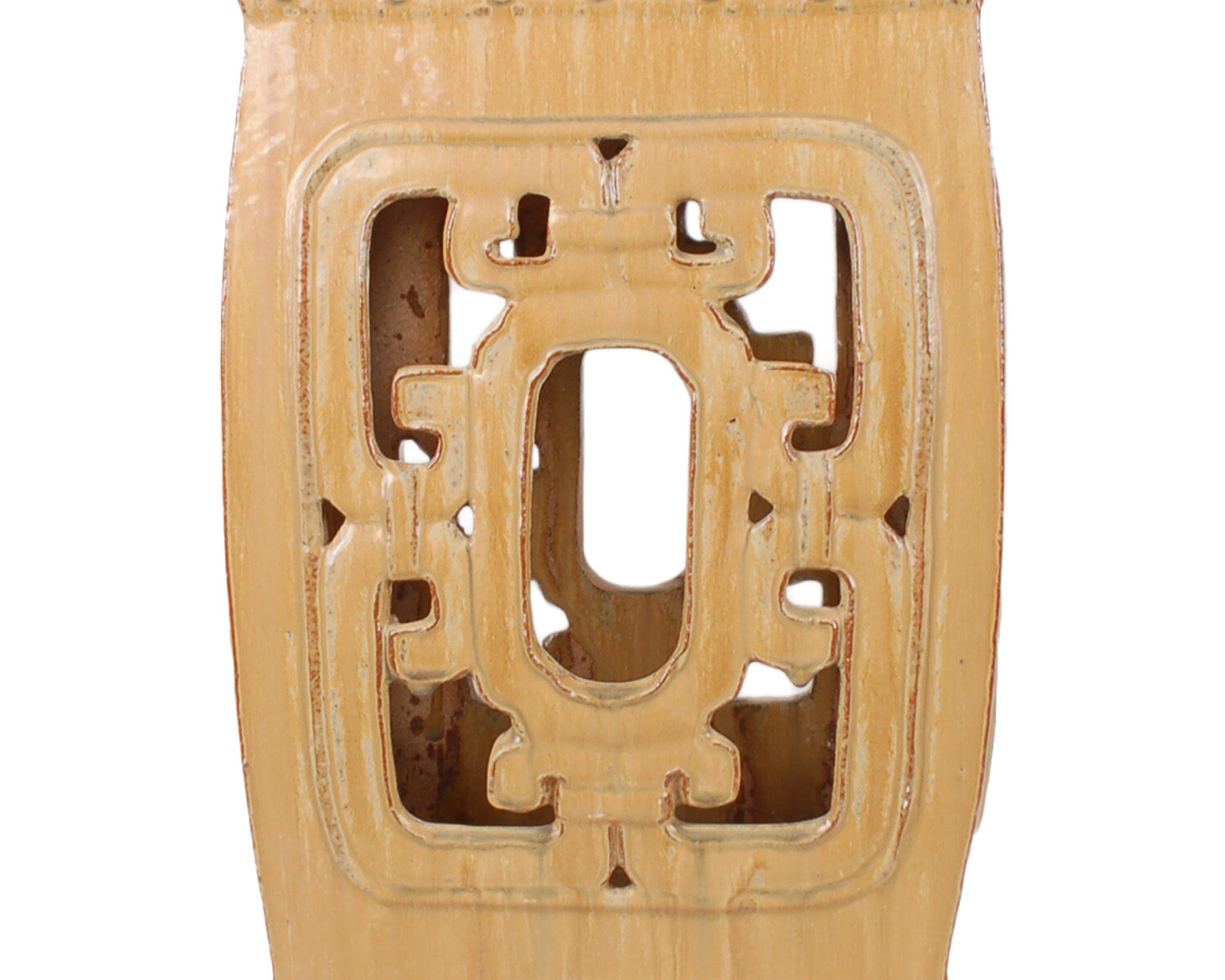 Reproduction porcelain garden seat in square shape featuring hand carved design and finished with a reactive glaze in butter yellow. Each piece is finished in a wood-fired dragon kiln where they’re sealed in by bricks and fired for days at 1,500° F and higher. The glaze naturally reacts to the heat in the kiln for an organic, unique finish.