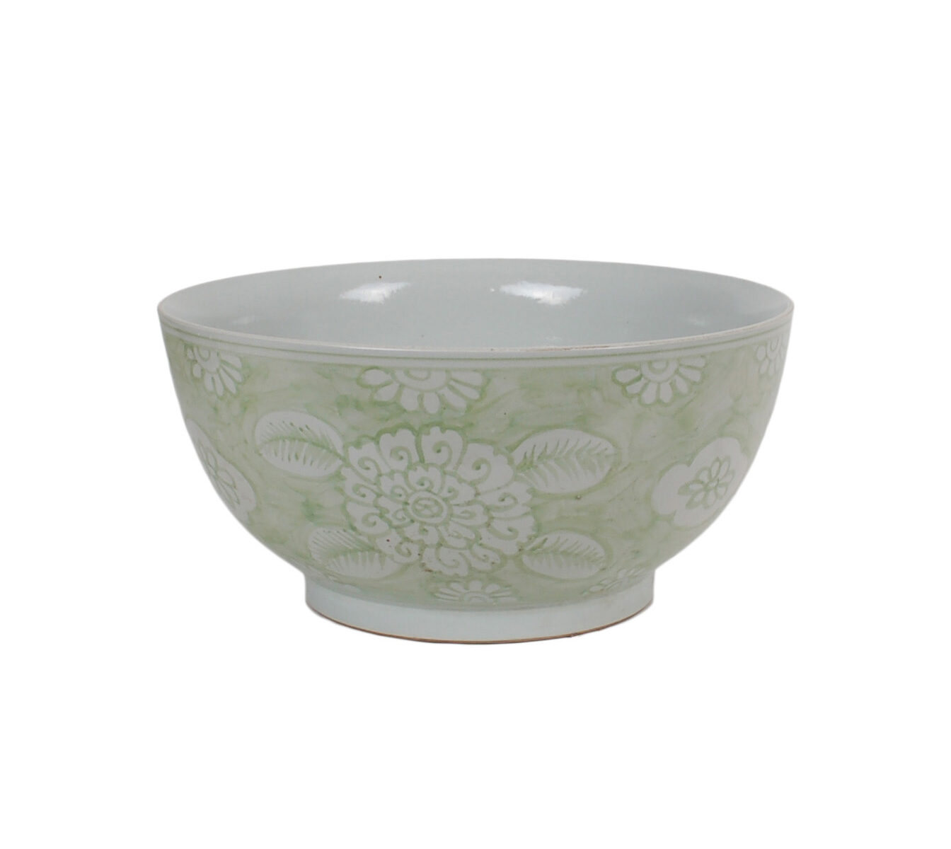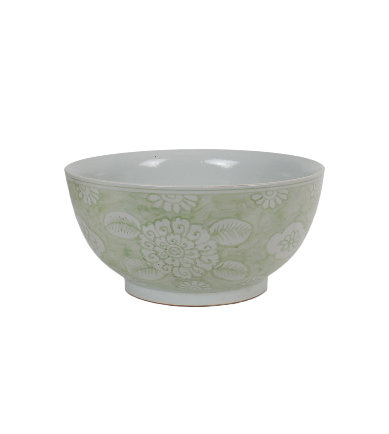Reproduction porcelain bowl with hand-painted washed green and white floral design.Antique finish and uneven surface is intentional and added for more character.