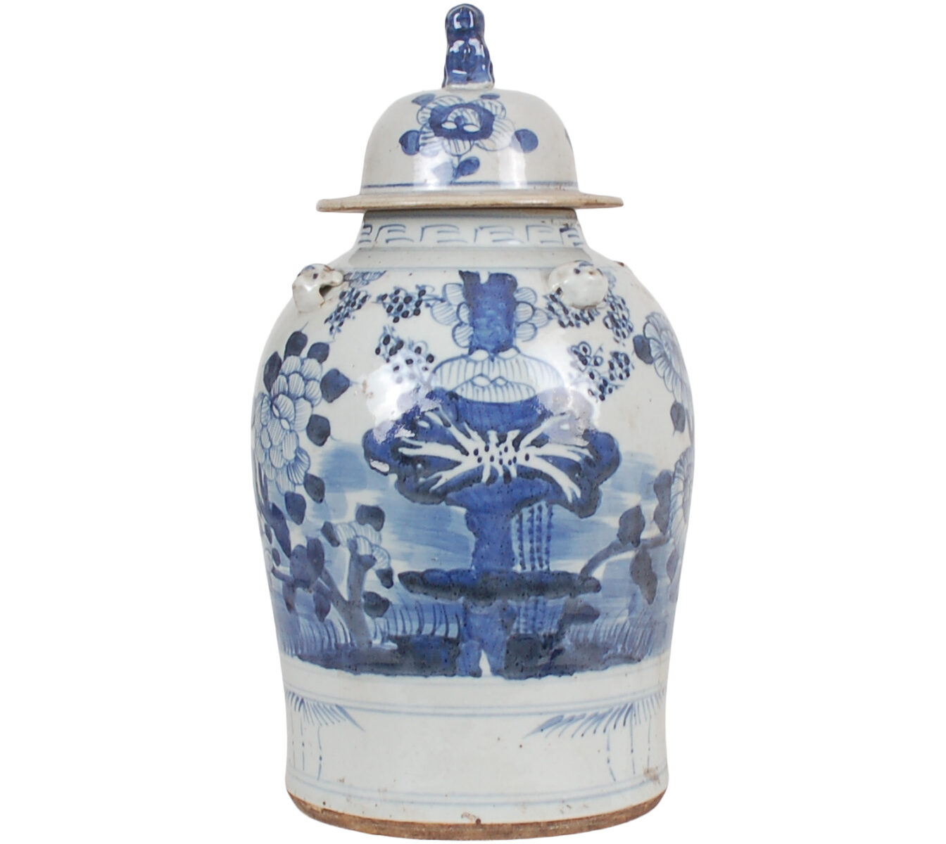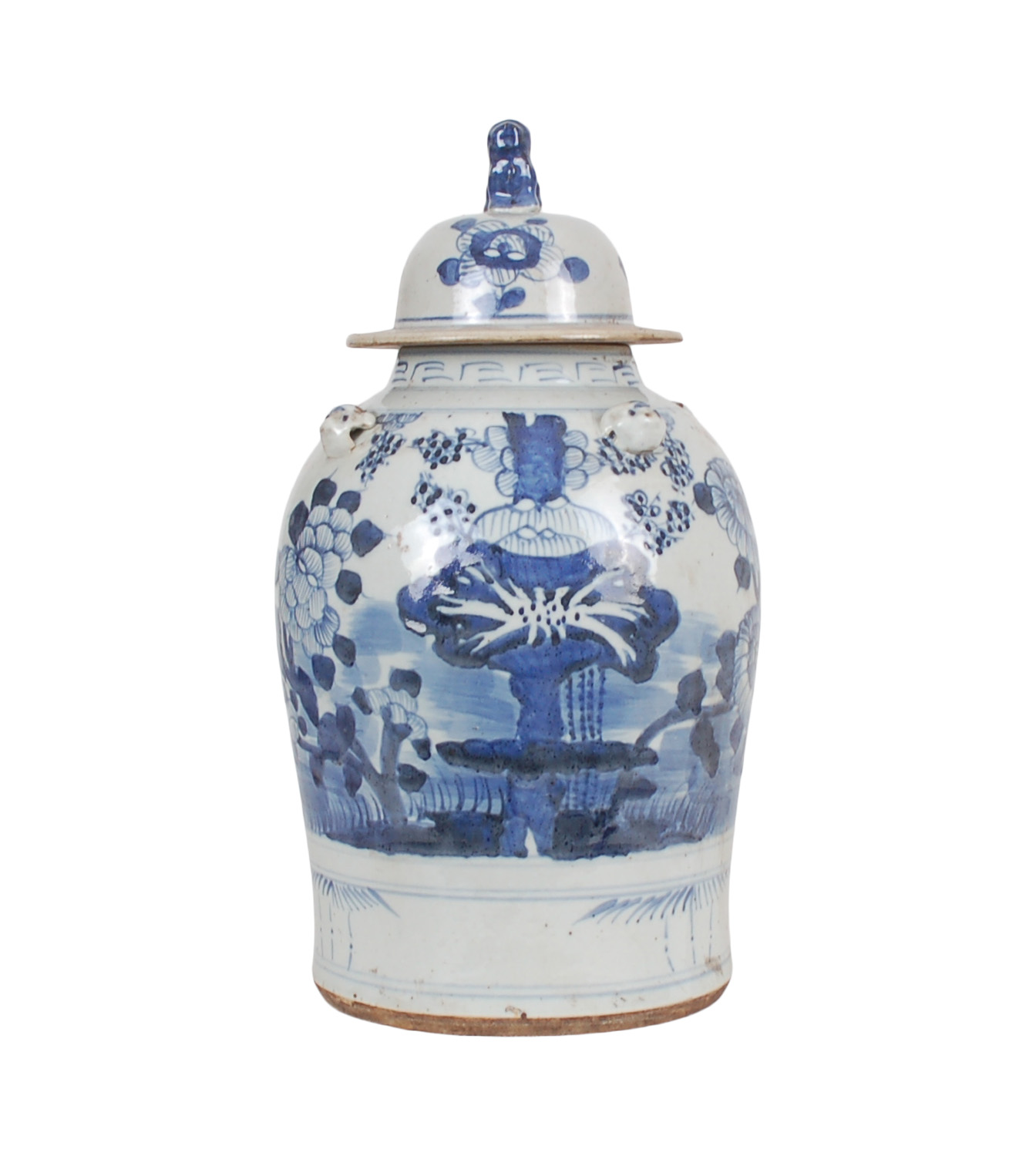 Reproduction porcelain jar with hand-painted blue and white lotus design. Made with foot-stomped clay.