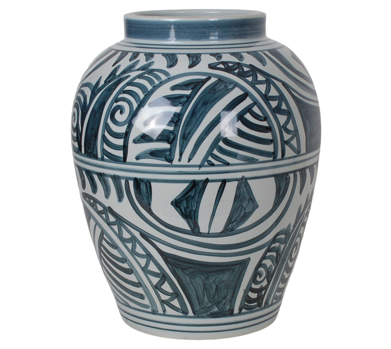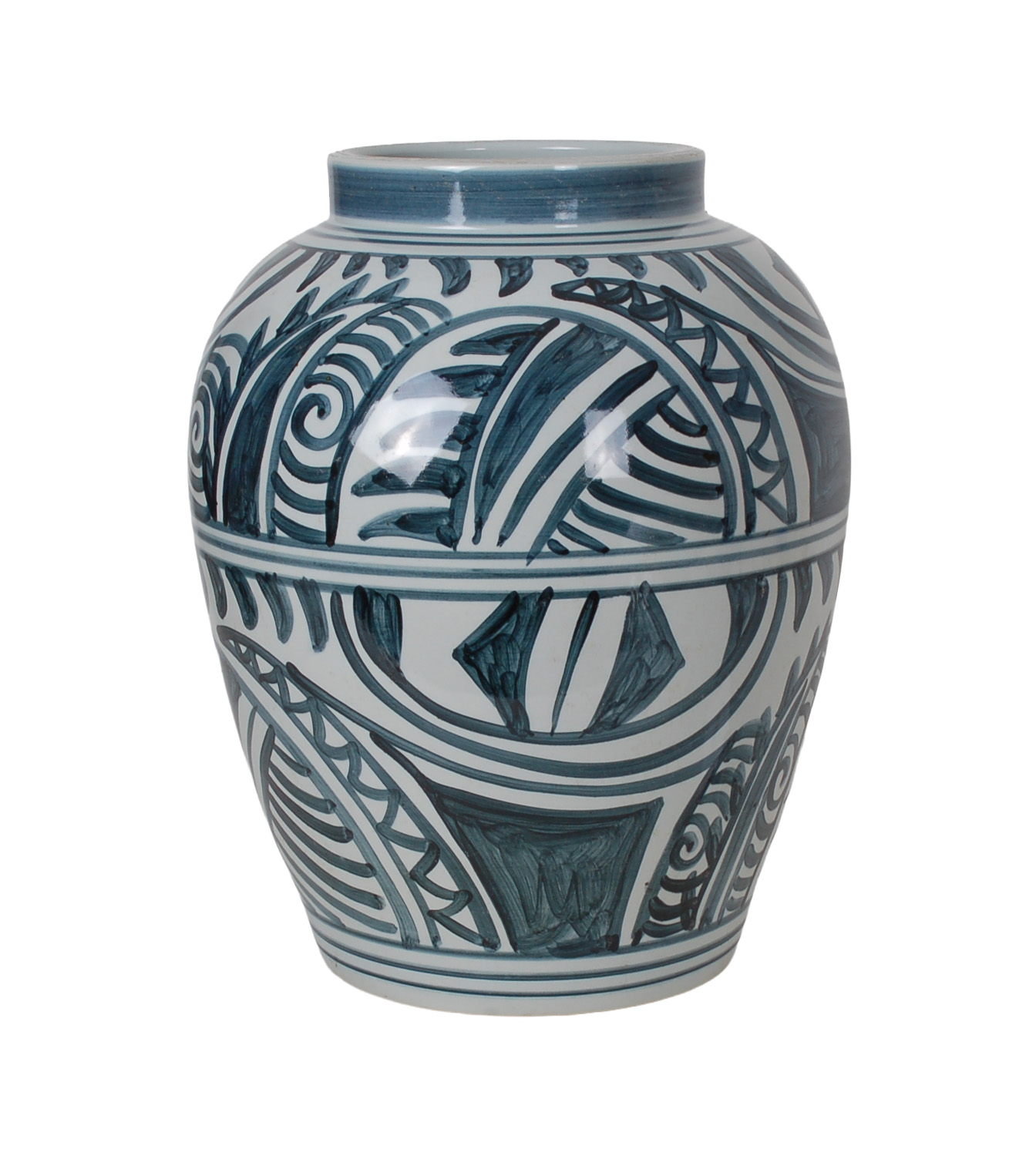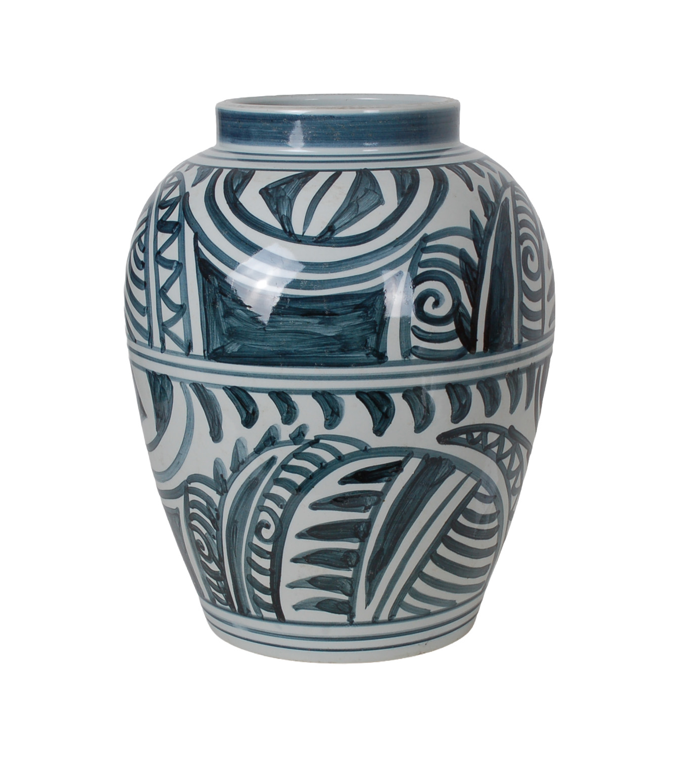 Reproduction porcelain vase featuring an expressive hand-painted blue and white abstract scroll and geometric motif. Antique finish and uneven surface is intentional and added for more character.