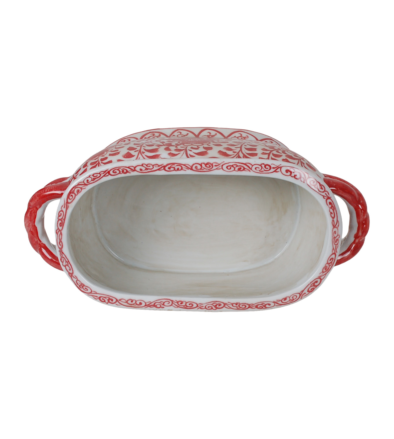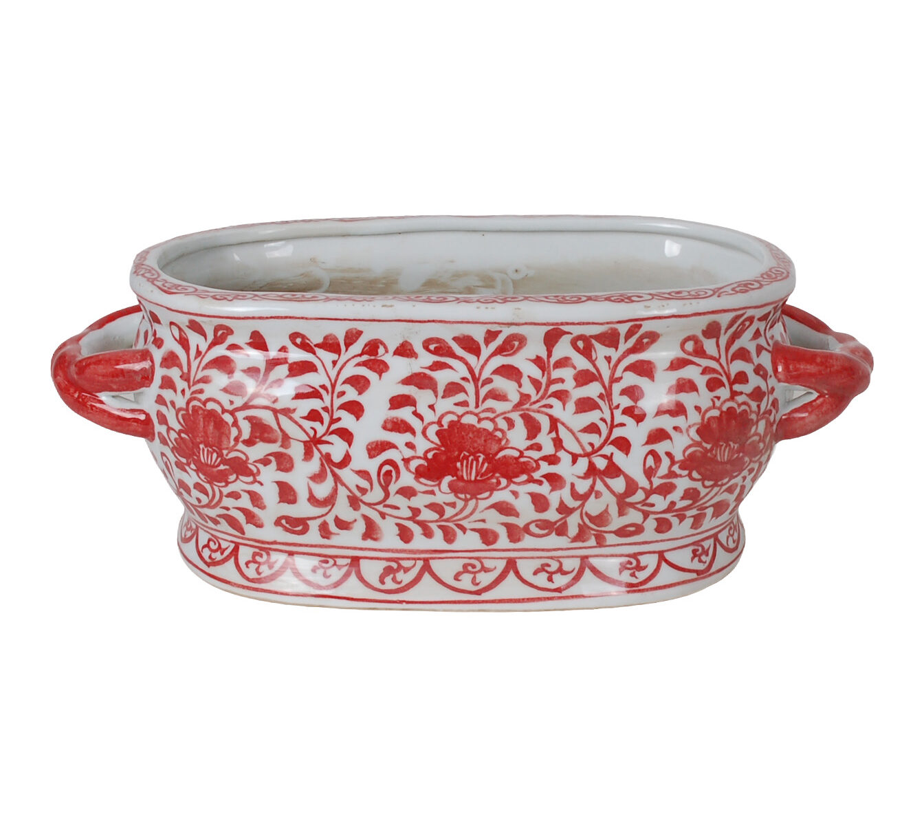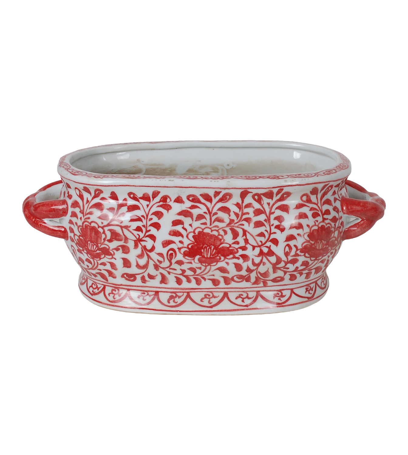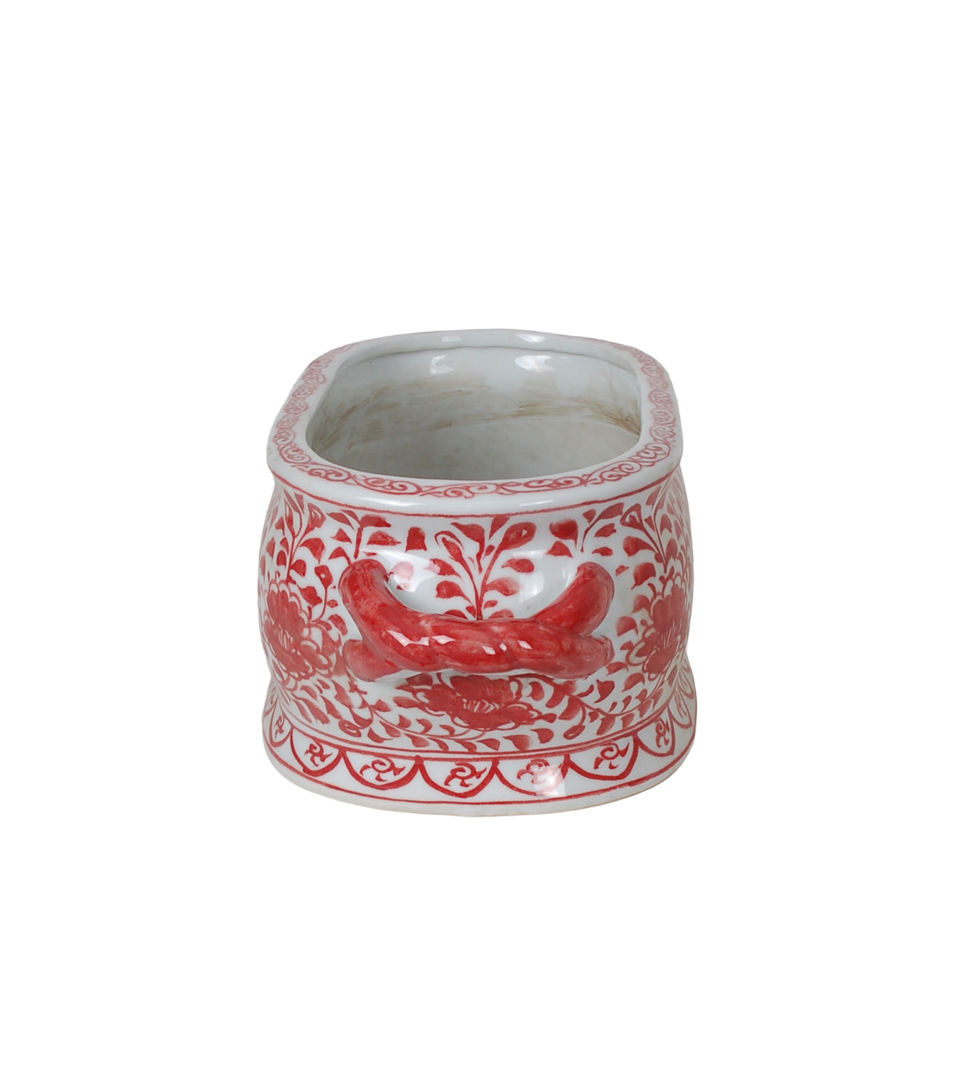 Reproduction porcelain vase with hand-painted red and white floral design. Antique finish and uneven surface is intentional and added for more character.