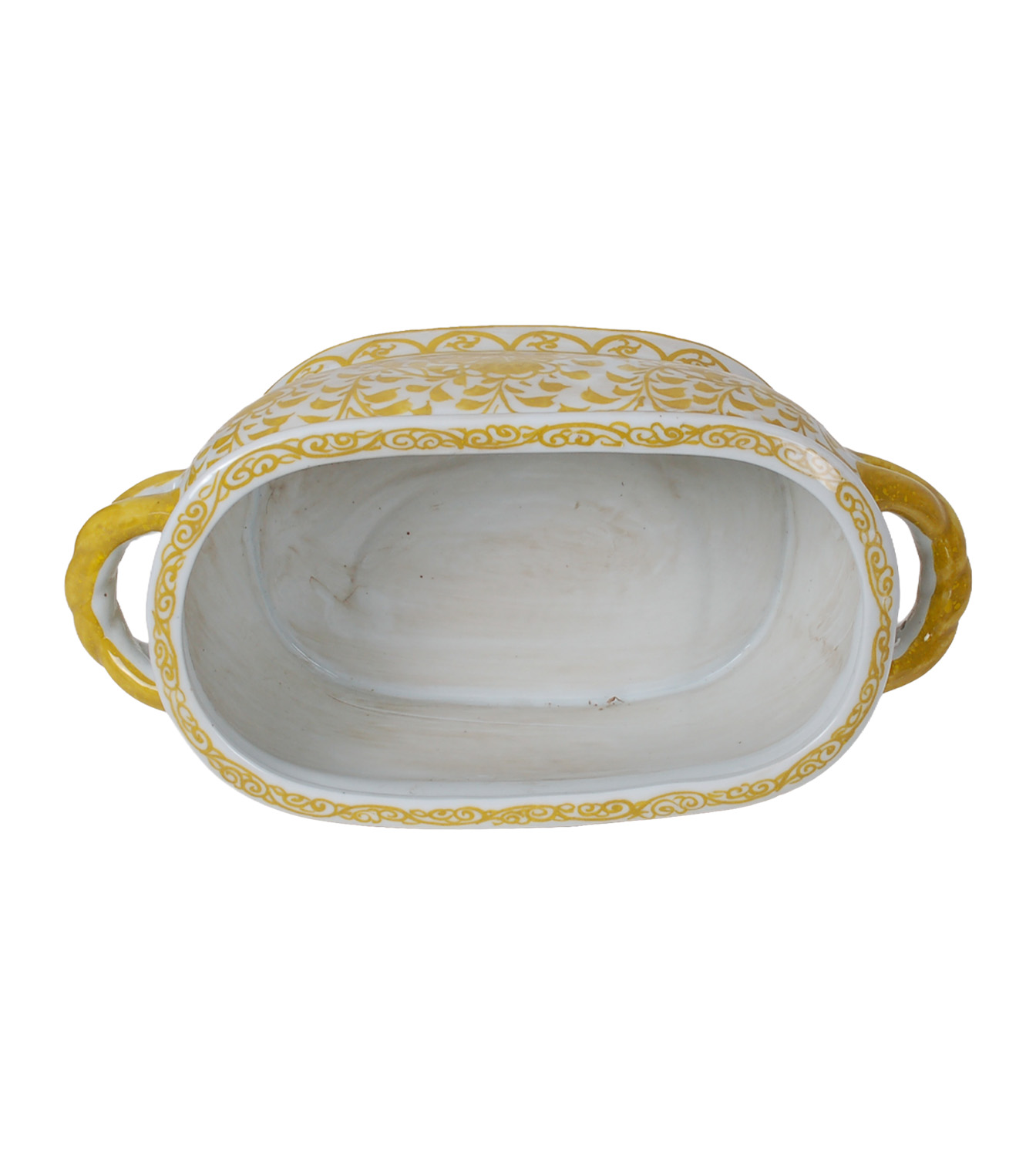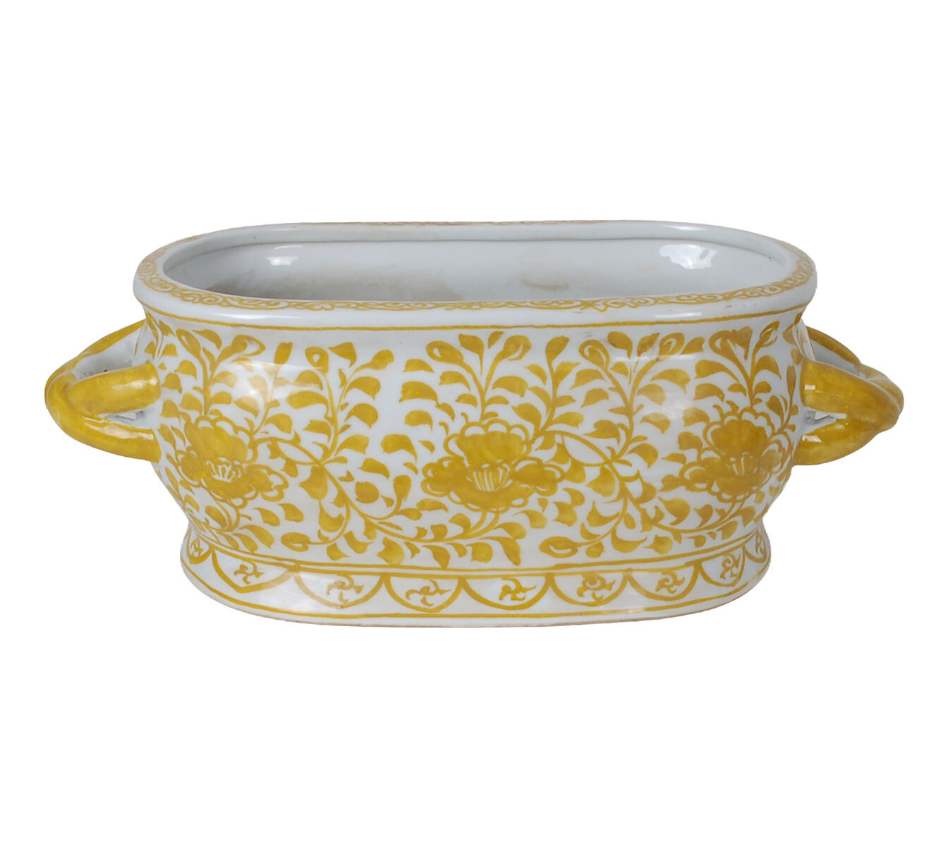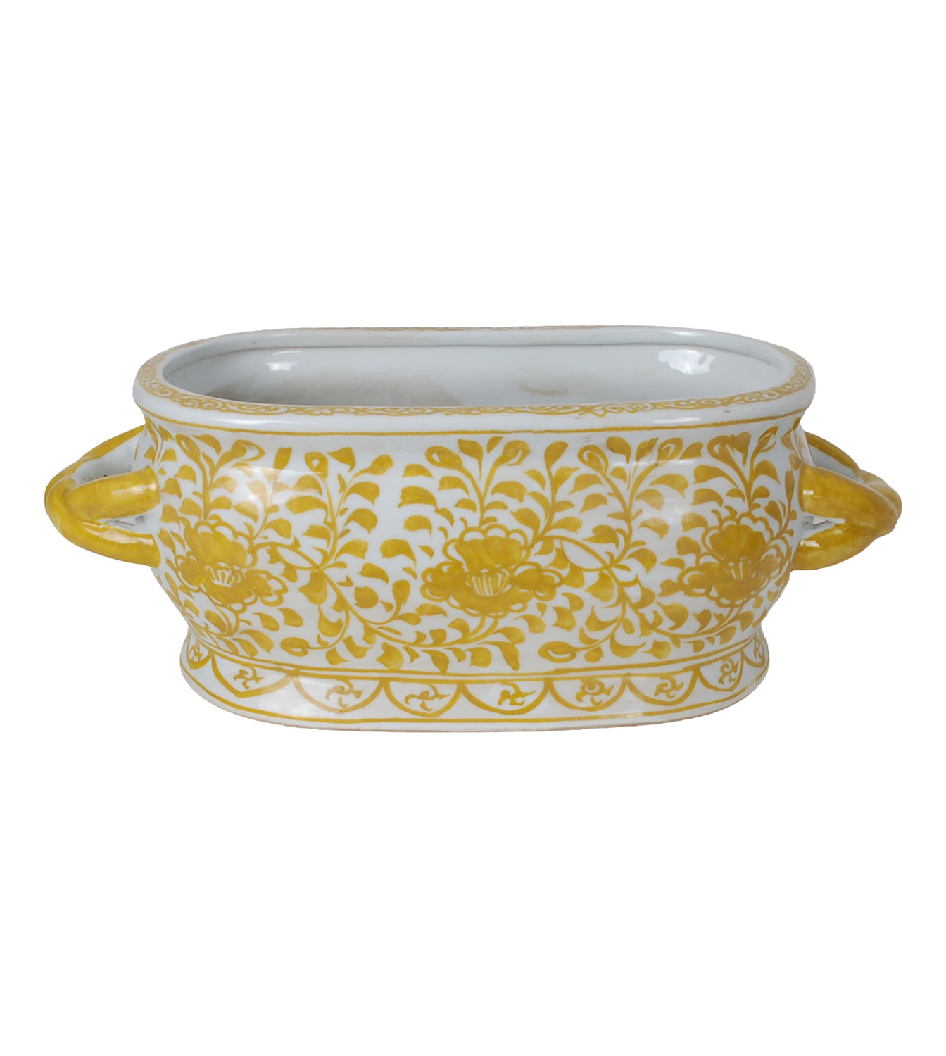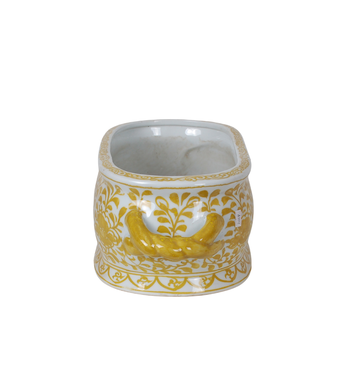 Reproduction porcelain vase with hand-painted yellow and white floral design. Antique finish and uneven surface is intentional and added for more character.