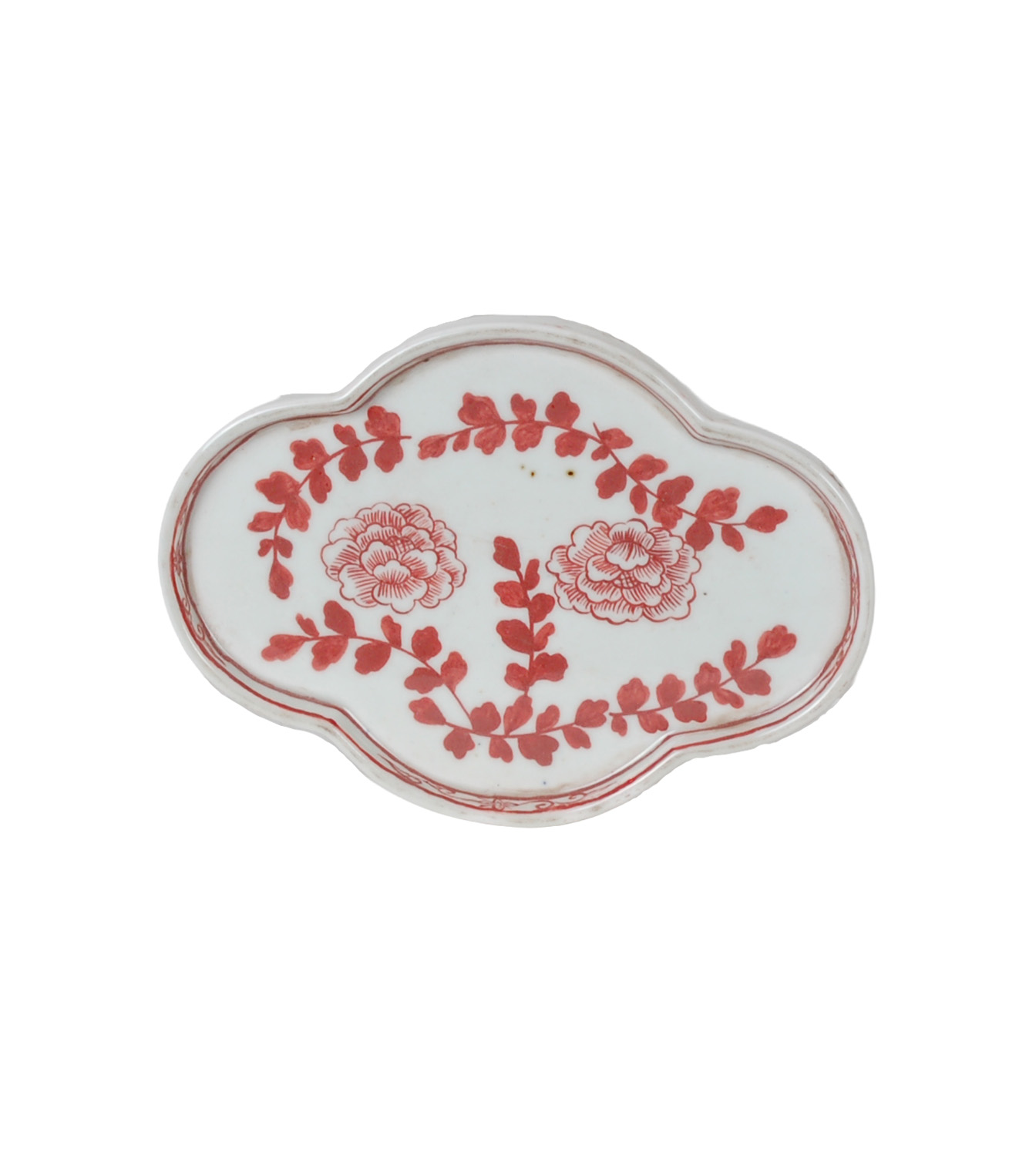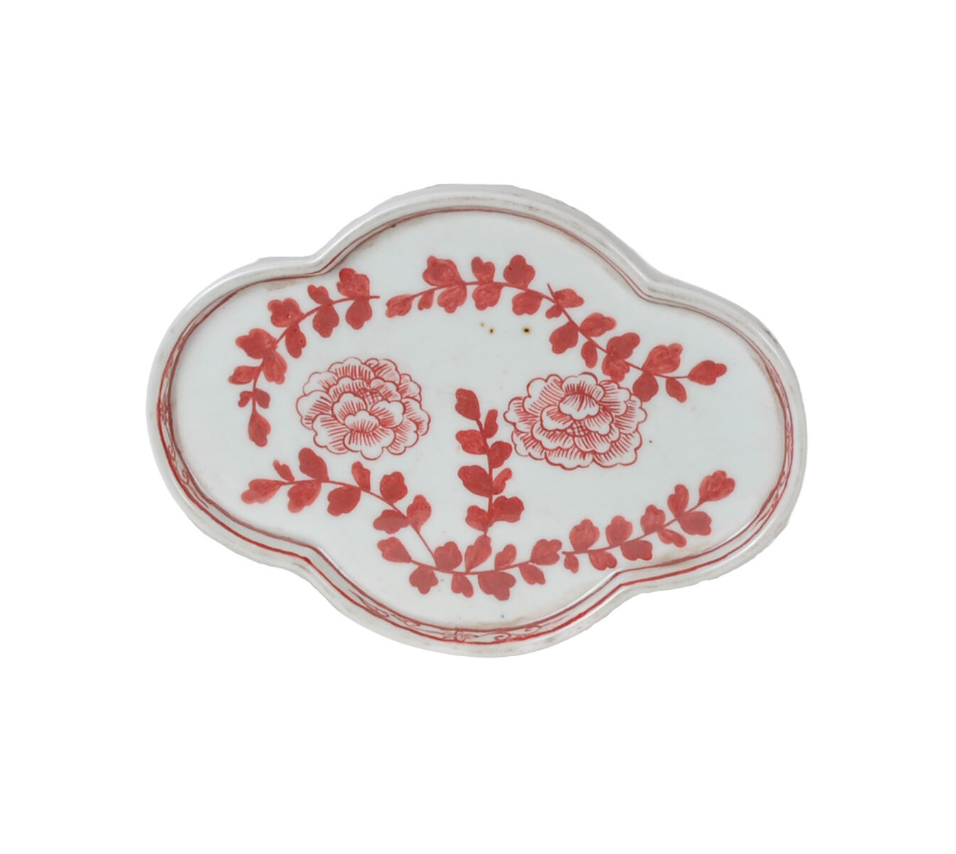 Reproduction porcelain vase with hand-painted red and white peony vine design. Antique finish and uneven surface is intentional and added for more character.