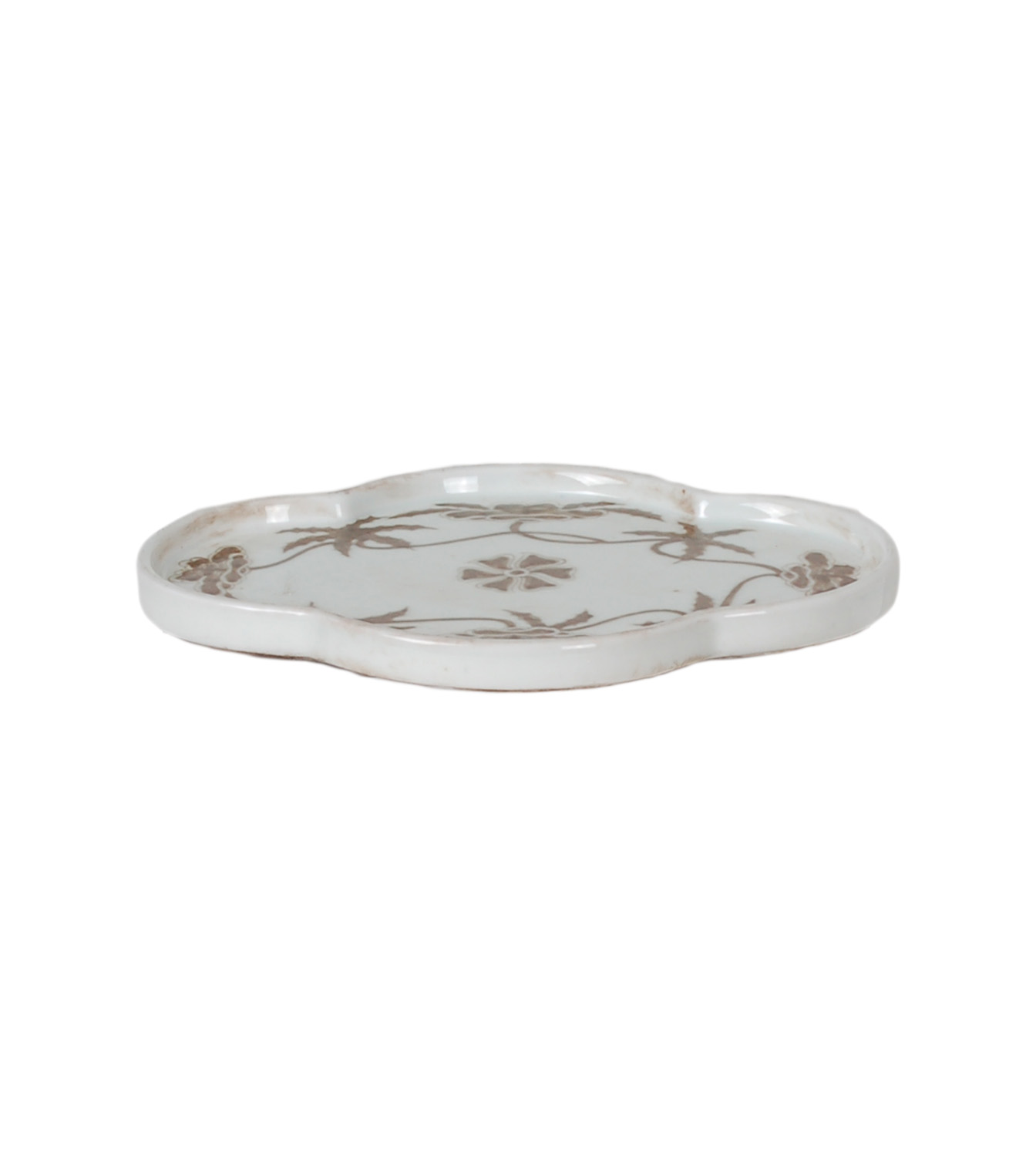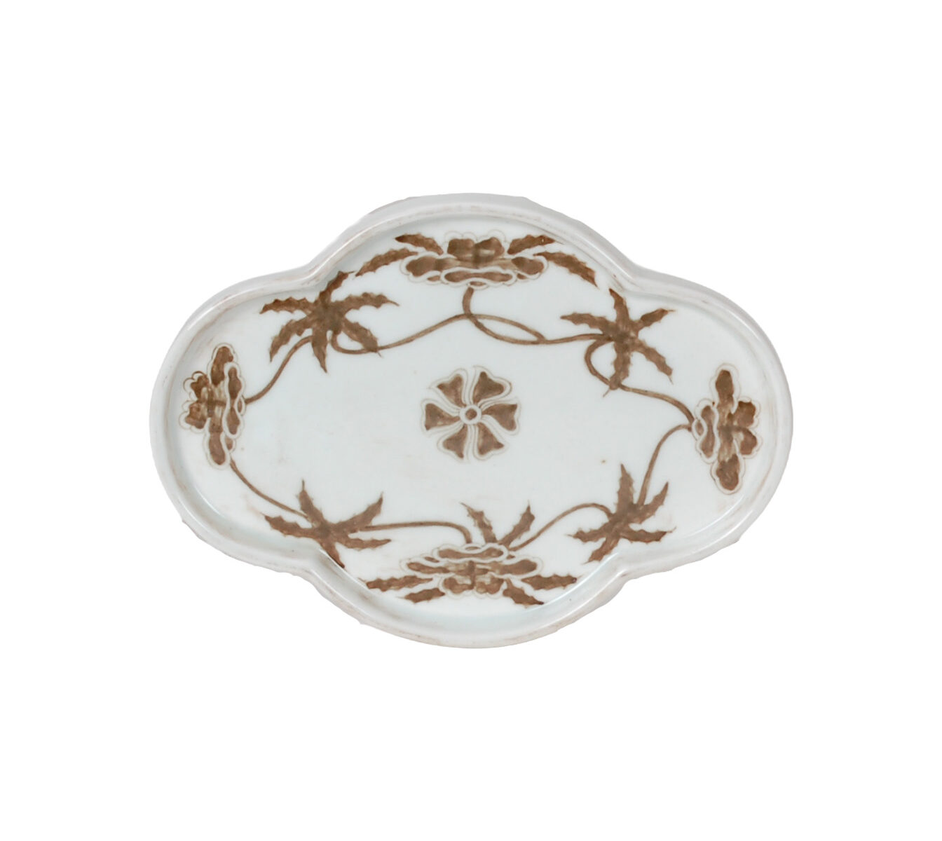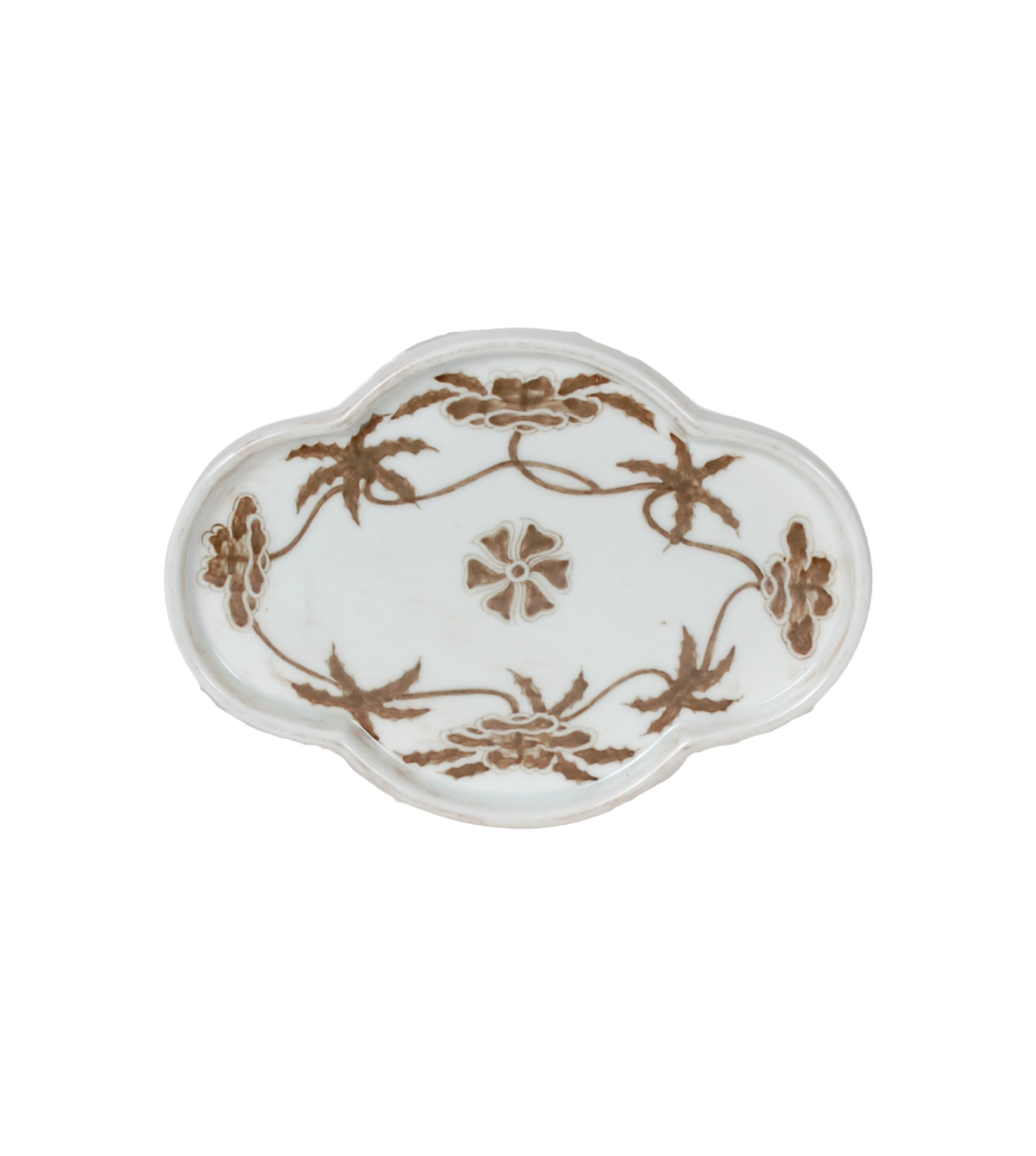 Reproduction porcelain vase with hand-painted sepia brown and white floral vine design. Antique finish and uneven surface is intentional and added for more character.