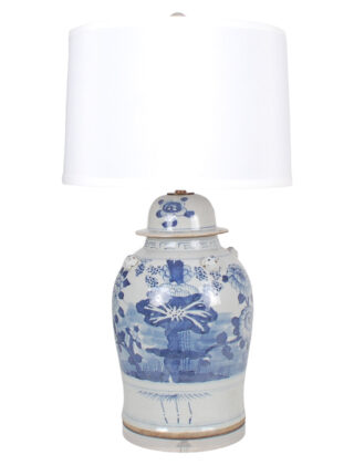 Reproduction porcelain rectangular jar lamp with hand-painted multicolored floral design. Assembled on an acrylic base with drum shade. Features real brass hardware with hand-rubbed antique finish, 3-way turn knob switch, and compatible with 150 watt bulb max. All lamps are made to order and final sale.